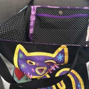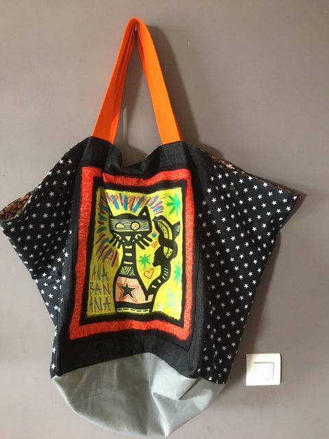 grand cabas XXL en jean noir et doublé, avec une grande poche zippée et un accroche clé. lavable en machine a 30°.